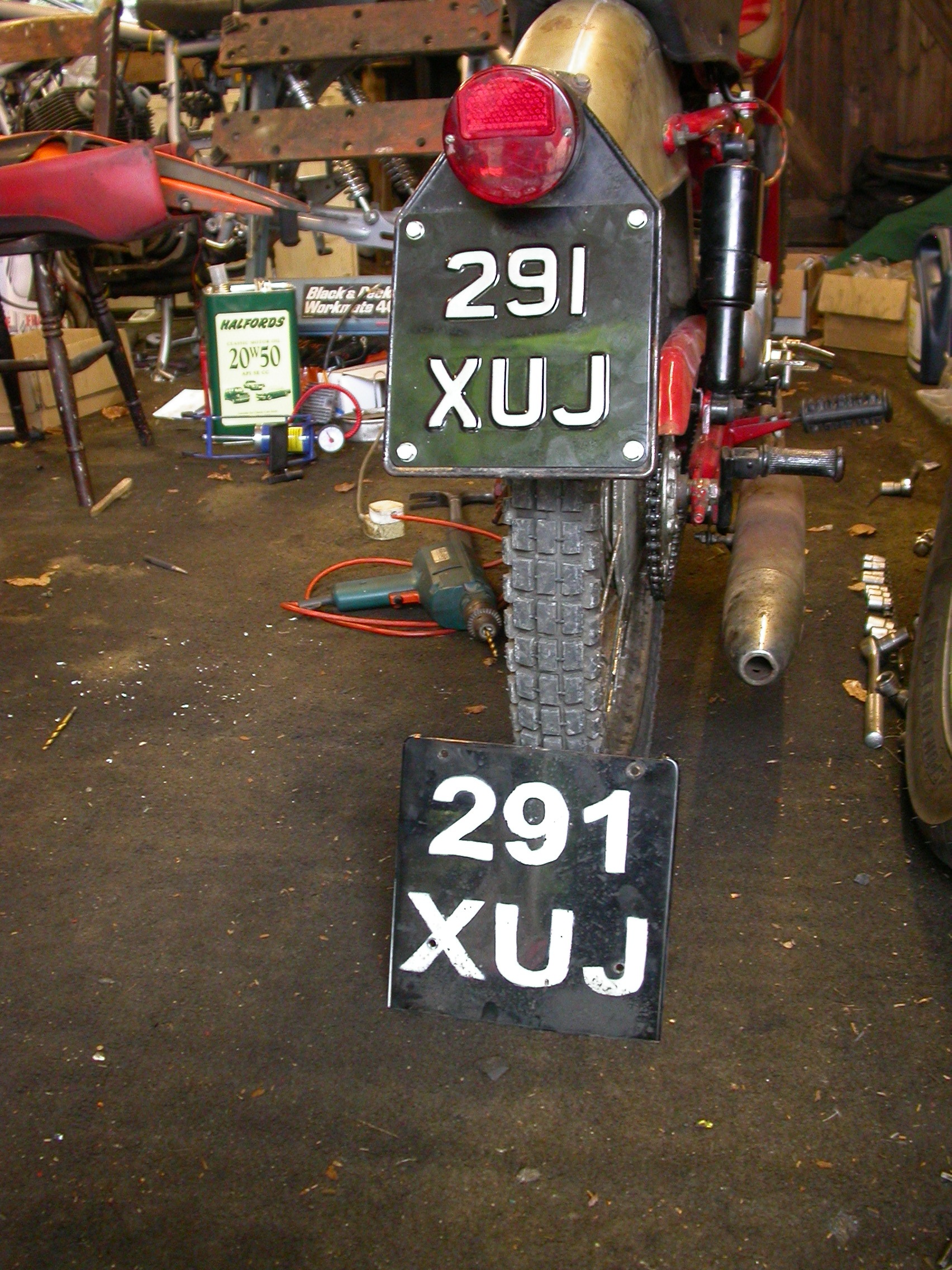 I also got round to fitting a proper numberplate. It was off with the hand stenciled plate (a cut down item off an Indian Royal Enfield no less) and on with the small (illegal?) pressed black and white aluminum job. Incidentially although the number is just a random jumble supplied by DVLA I was told at Stafford that the letters identify it as having been originally registered in Shropshire.